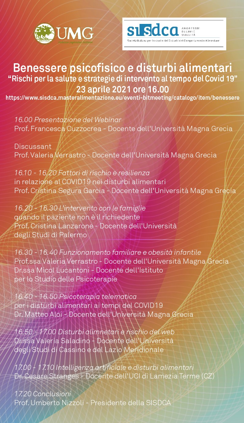 Si avvisano gli studenti che il giorno 23 aprile 2021 alle ore 16.00, si svolgerà, in via telematica, il Simposio “Benessere psicofisico e disturbi alimentari”. Gli studenti potranno iscriversi accedendo, esclusivamente con la mail istituzionale, al seguente link: https://www.sisdca.