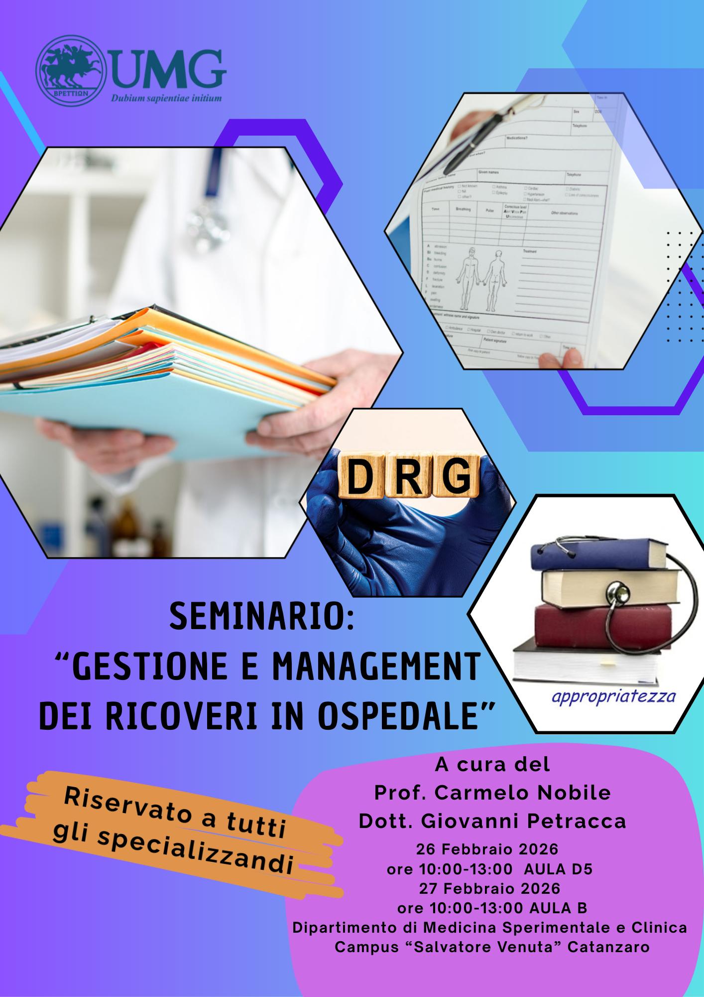Seminario "Gestione e Management dei ricoveri in ospedale" - a cura del Proff. Carmelo Nobile e del Dott. Giovanni Petracca - 26 e 27 Febbraio 2026 ore 10:00 Aula D5 (locandina allegata)
